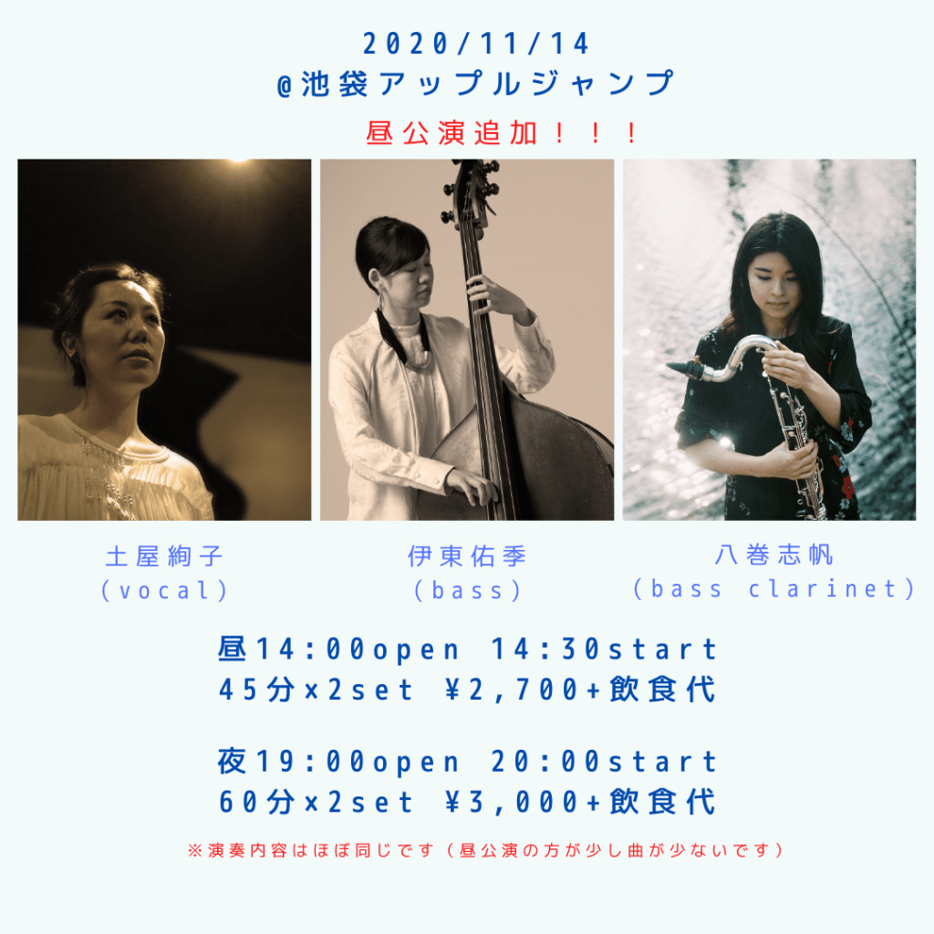 11/14(土)追加しました Posted on 2020/10/30 投稿者: yukichi 0 夜公演、早々に満席のご予約をいただき、ありがとうございます。急遽、昼公演も追加いたしました。現在夜公演をご予約いただいている方で、昼に変更希望の方はお店へご連絡ください。(内容はほぼ同じなので、現時点ではどちらか1公演のご予約でお願いしたいです。)現時点で夜公演は満席となっております。志帆さんとは初共演!なかなかできないトリオですので、ぜひ聞きにきていただきたいです! 共有: クリックして X で共有 (新しいウィンドウで開きます) X Facebook で共有するにはクリックしてください (新しいウィンドウで開きます) Facebook いいね 読み込み中… 関連