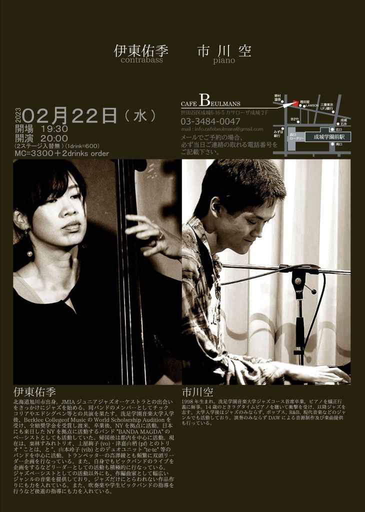今日は成城学園前カフェブールマンでライブです Posted on 2023/02/22 投稿者: yukichi 0 都内で市川さんとのデュオは初です!ぜひ聞きにいらしてください2023/2/22(水)デュオwith 市川空@成城学園前カフェブールマンopen 19:30 / start 20:00-市川空(pf) 共有: クリックして X で共有 (新しいウィンドウで開きます) X Facebook で共有するにはクリックしてください (新しいウィンドウで開きます) Facebook いいね 読み込み中… 関連