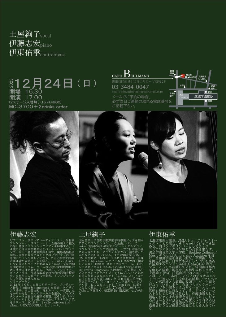 今日は成城学園前カフェブールマンでライブです Posted on 2023/12/24 投稿者: yukichi 0 今年のクリスマスイブは大好きなお2人と!!ぜひお越しくださいませ2023/12/24(日)トリオ@成城学園前カフェブールマンopen 16:30 / start 17:00-土屋絢子(vo)伊藤志宏(pf)