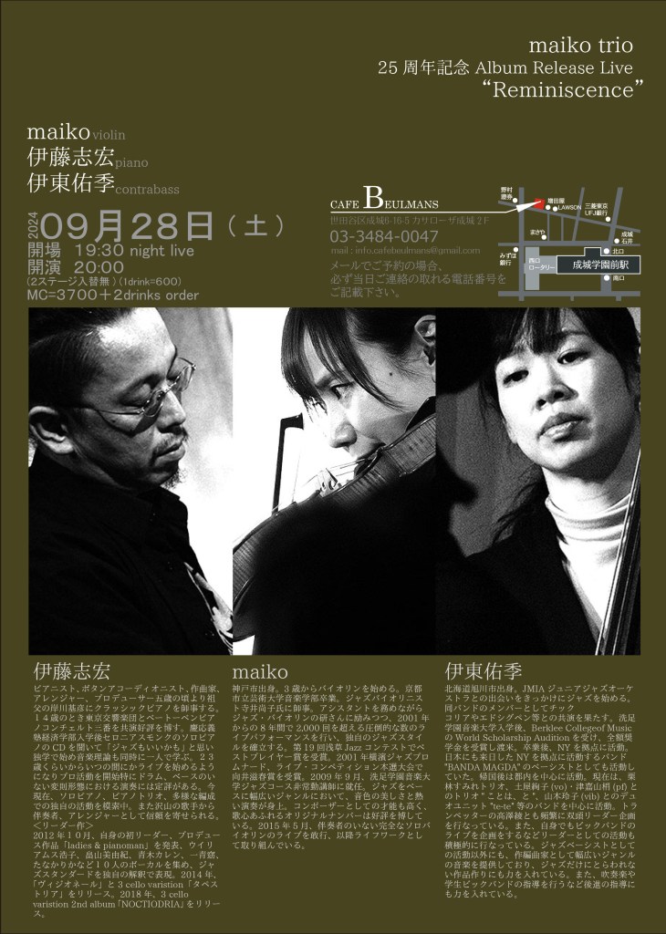 今日は成城学園前カフェブールマンでライブです Posted on 2024/09/28 投稿者: yukichi 0 2024/9/28(土夜)maikoトリオレコ発!!@成城学園前カフェブールマンopen 19:30 / start 20:00-maiko(vn)伊藤志宏(pf) 共有: クリックして X で共有 (新しいウィンドウで開きます) X Facebook で共有するにはクリックしてください (新しいウィンドウで開きます) Facebook いいね 読み込み中… 関連