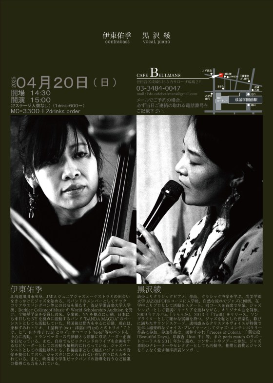 今日は成城学園前カフェブールマンでライブです Posted on 2025/04/20 投稿者: yukichi 0 2025/4/20(日)デュオ@成城学園大学前カフェブールマンopen 14:30 / start 15:00-黒沢綾(vo) 共有: クリックして X で共有 (新しいウィンドウで開きます) X Facebook で共有するにはクリックしてください (新しいウィンドウで開きます) Facebook いいね 読み込み中… 関連