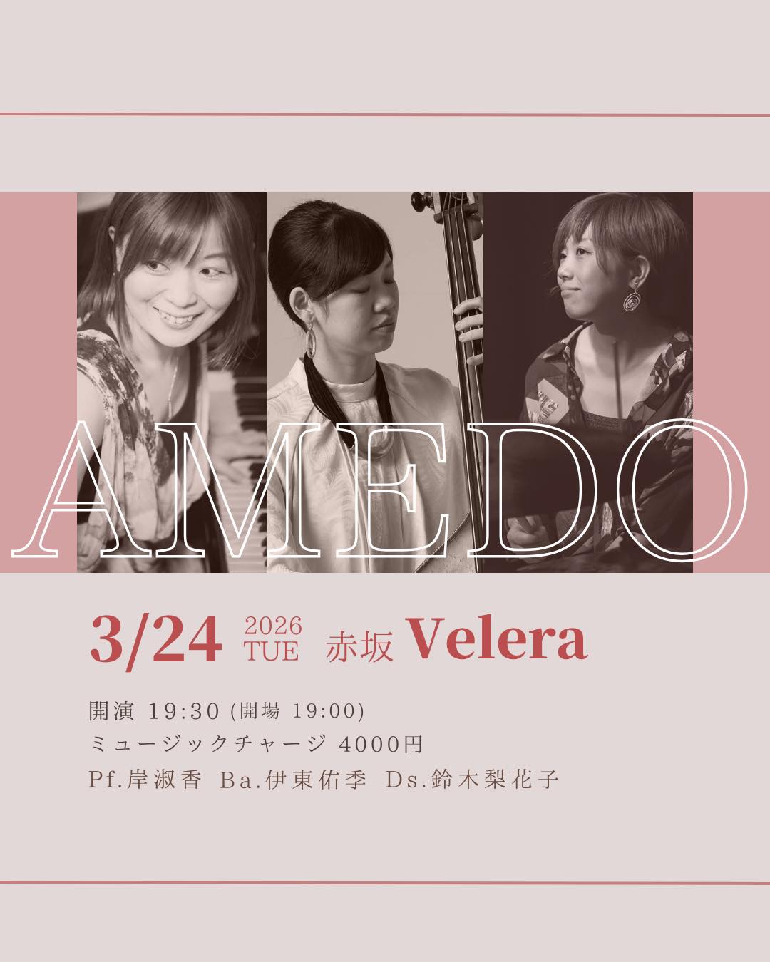 今日は赤坂ベレラでライブです Posted on 2026/03/24 投稿者: yukichi 0 2026/3/24(火)AMEDO@赤坂ベレラopen 19:00 / start 19:30-岸淑香(pf)鈴木梨花子(dr) 共有: X で共有 (新しいウィンドウで開きます) X Facebook で共有 (新しいウィンドウで開きます) Facebook いいね 読み込み中… 関連